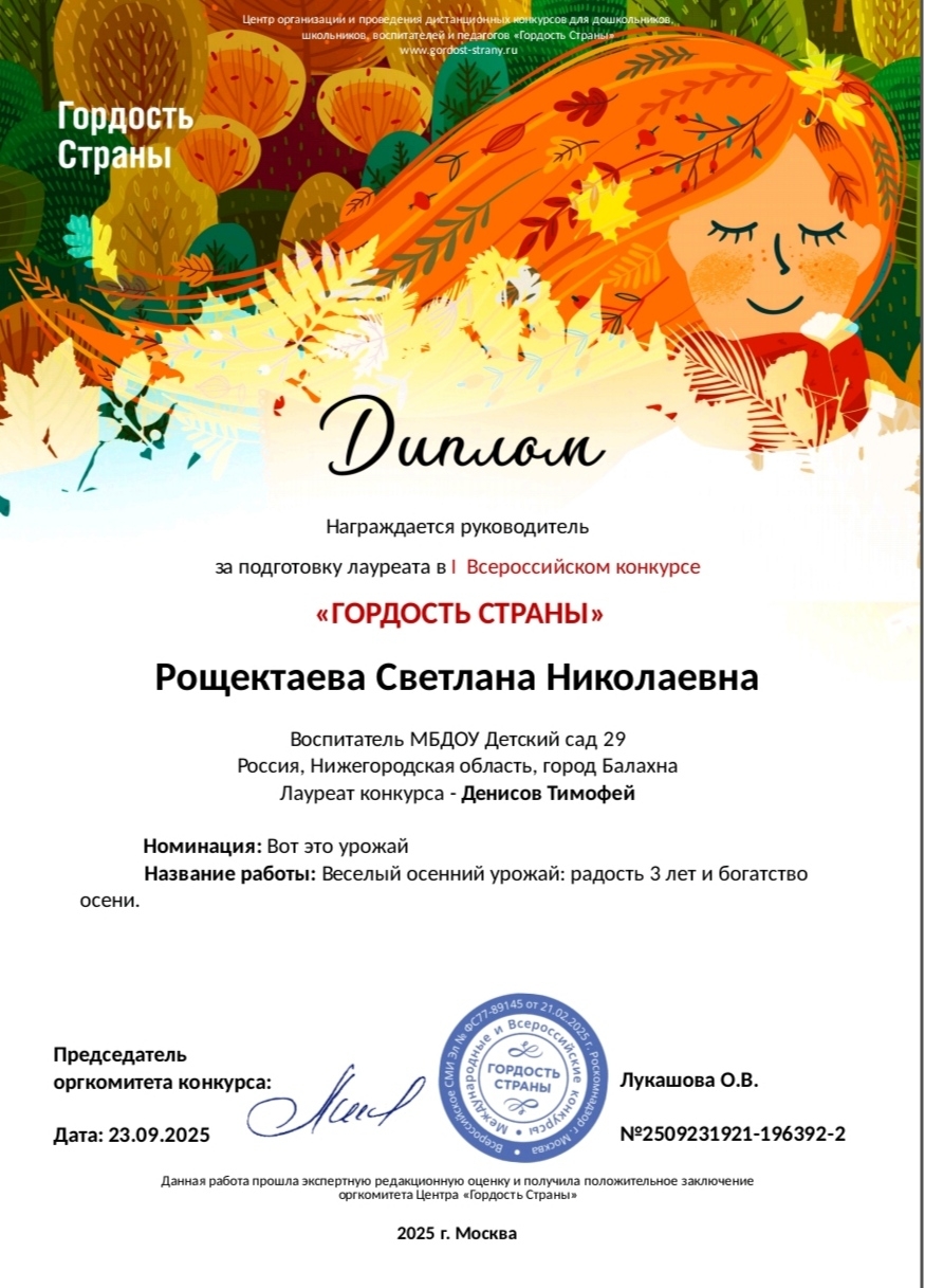Диплом за подготовку лауреата конкурса Денисова Тимофея в номинации "Вот это урожай "