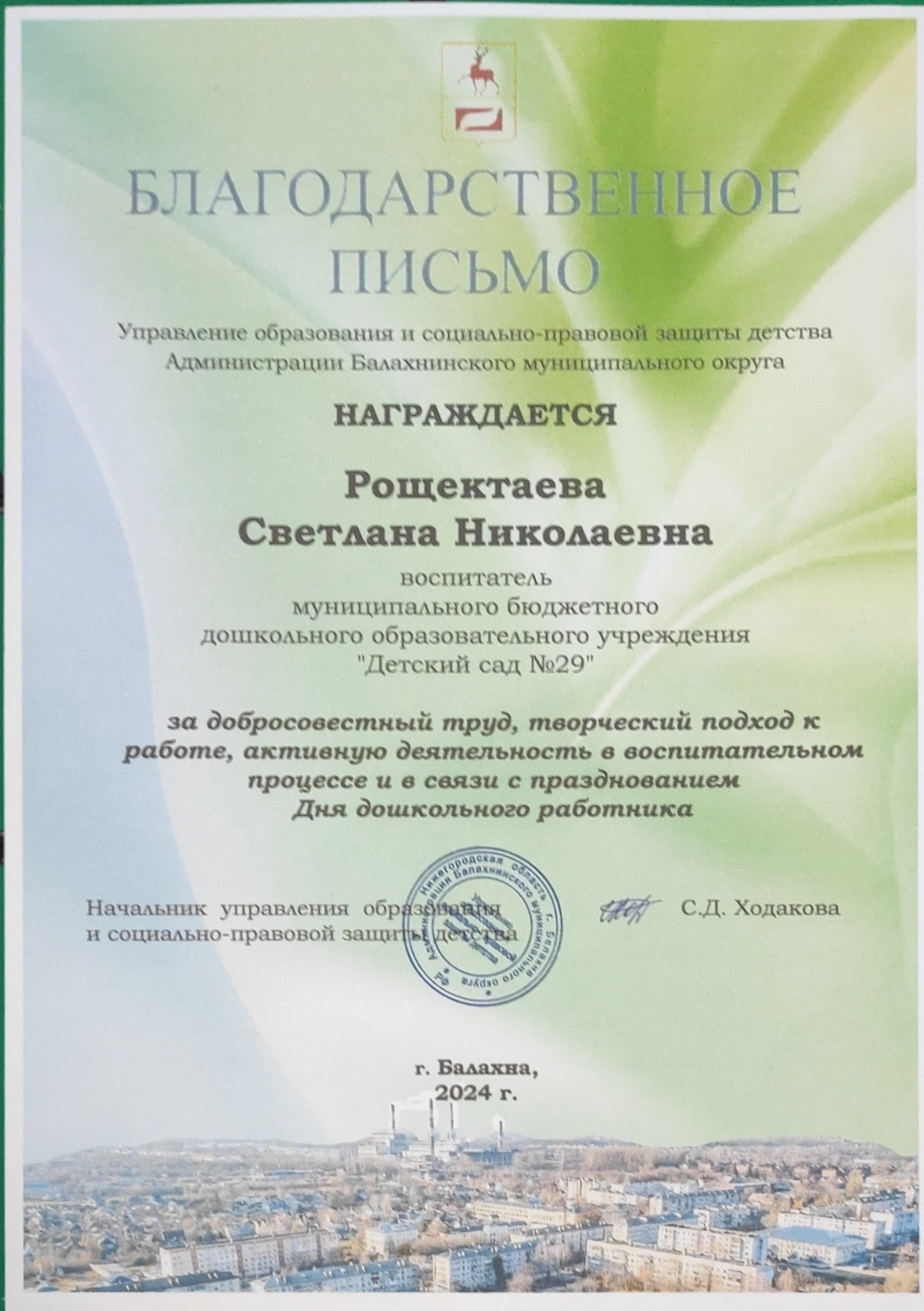 Благодарственное письмо от Администрации